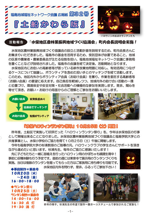 地域福祉の拡充や活動の広報ツールとして「土船かわら版」を隔月で発行。地域住民が編集委員となり、記事を執筆している。全世帯に配布すると共に支所や地域包括支援センター、市役所内関係各課に配布し、地域情報と共に発信している。住民による写真や絵画を紹介し、歴史や文化関連の記事も掲載し、住民本位の地域づくりと福祉との関係性向上に資するツールとして有効活用している